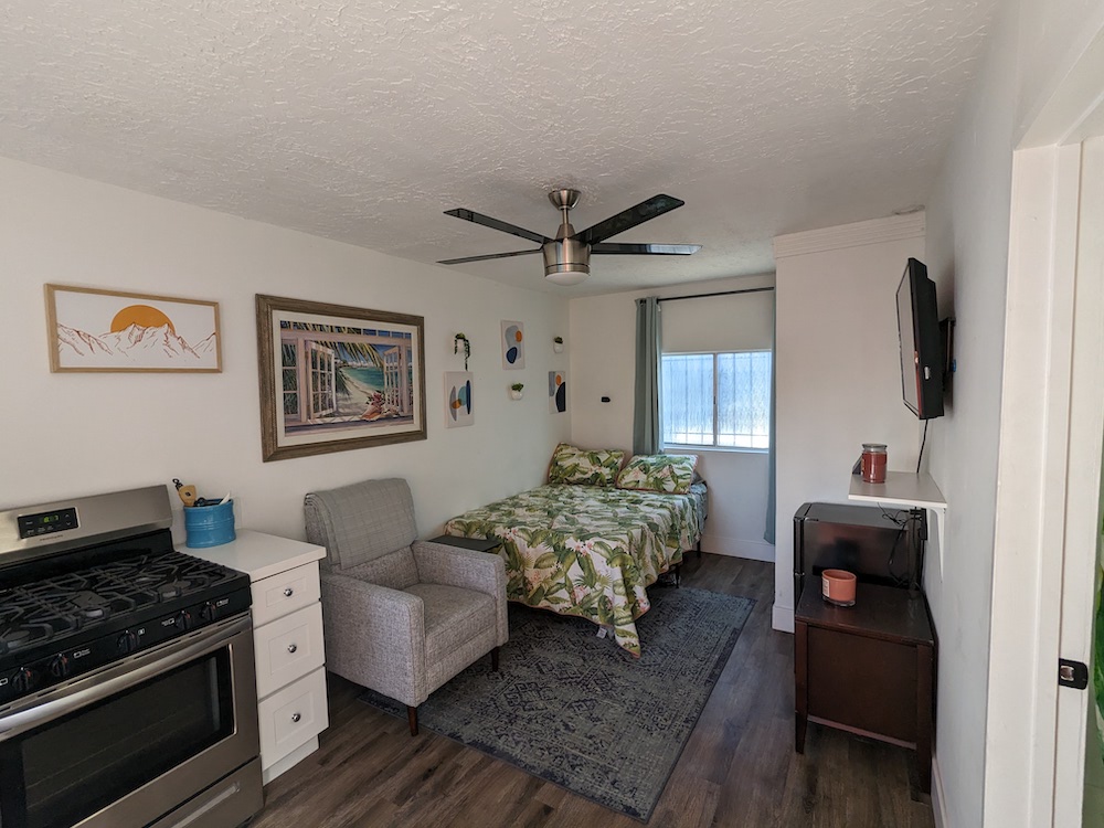 The Sunshine Daydream casita is a beautiful guest suite located between City Heights and North Park in San Diego, California. This casita has a full kitchen with brand new stainless steel appliances. There are plates, cups, pots, pans and other kitchen appliances in the cabinets. The flat top grill is available outside. To use, remove the grill cover, open the propane tank's handwheel left and then rotate the knobs on the grill to turn the gas on. Finally click the red ignite button to start the grill.